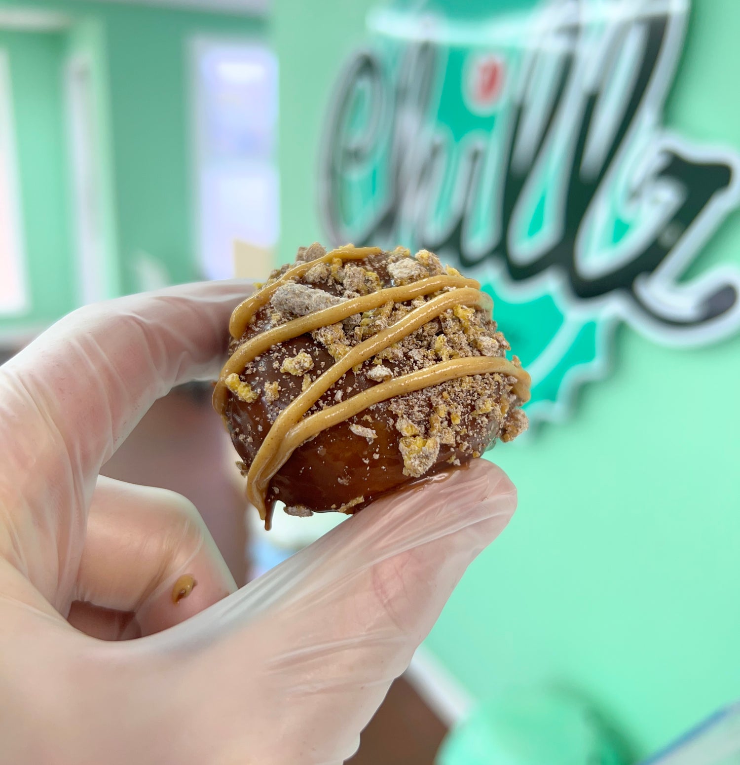 Our Chocolate icing smothered in puppy chow pieces and drizzled with peanut butter.