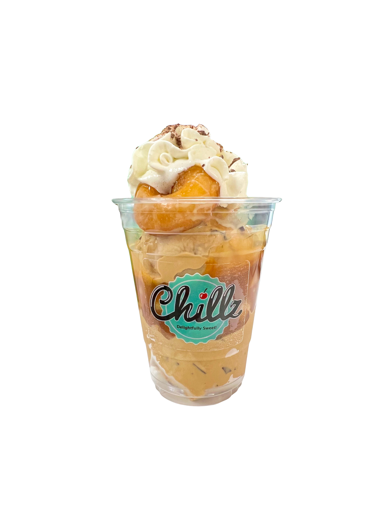 Our bold Coffee Lovers ice cream (A coffee base with chocolate flakes) paired with warm glazed donuts and hot caramel.