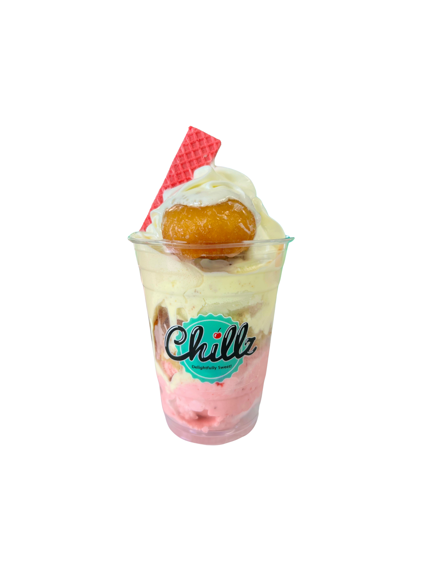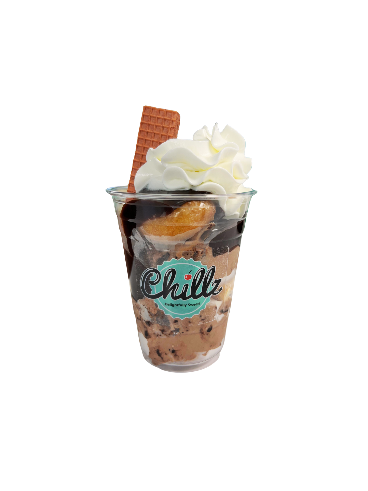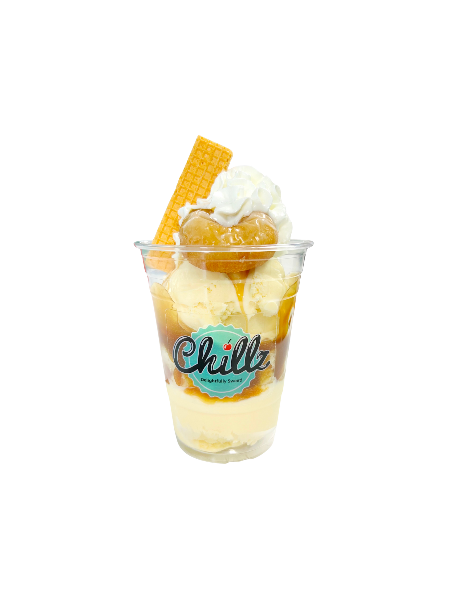Medium: Two scoops of ice cream with layers of our warm glazed donuts and a hot topping.