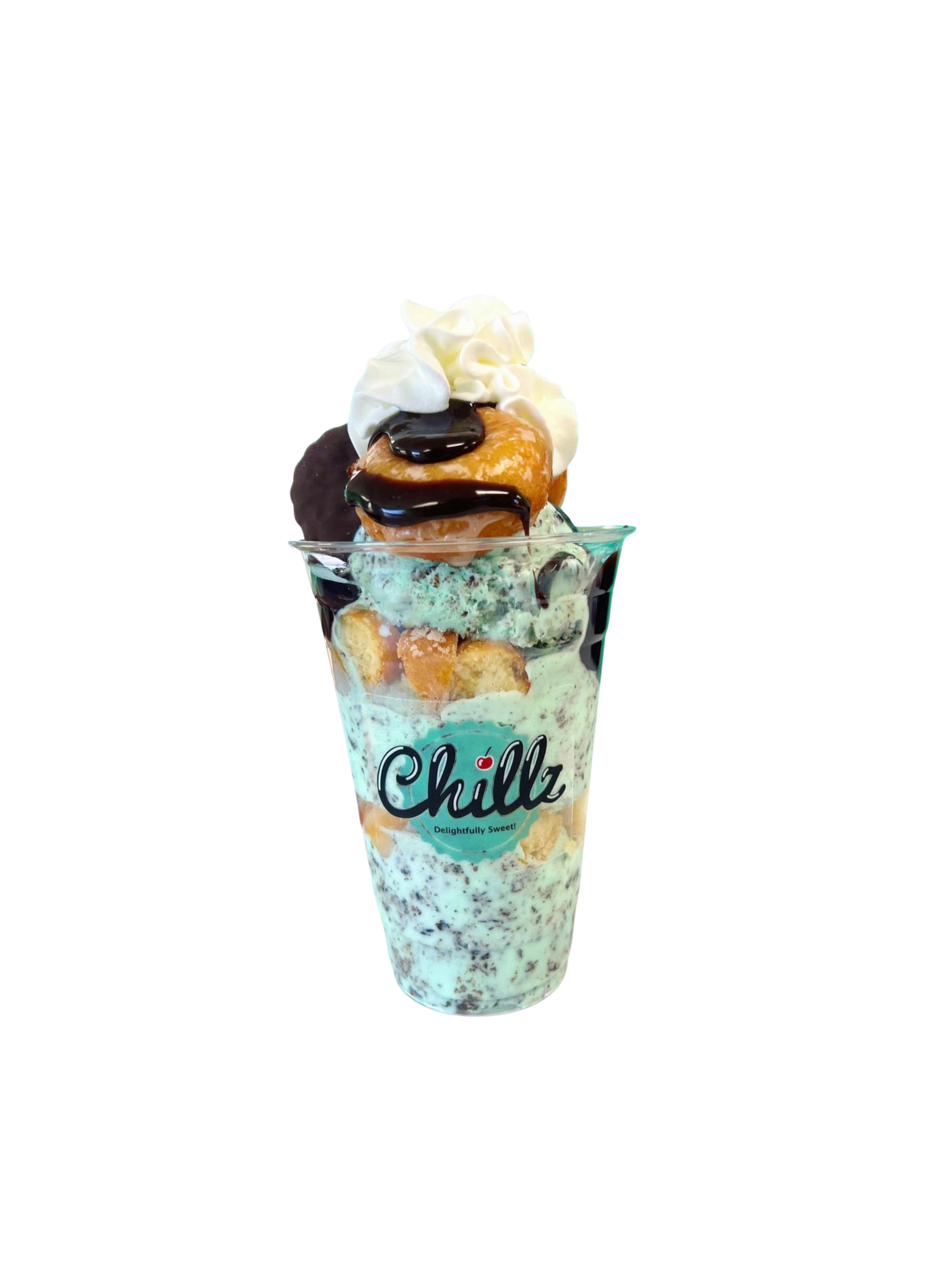 Our creamy Mint Chip ice cream with paper-thin flakes of chocolate blended throughout, paired with our warm glazed donuts and hot fudge.